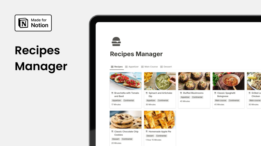 A straightforward, beginner-friendly Notion Recipes Manager Template that helps you cook more, search less.