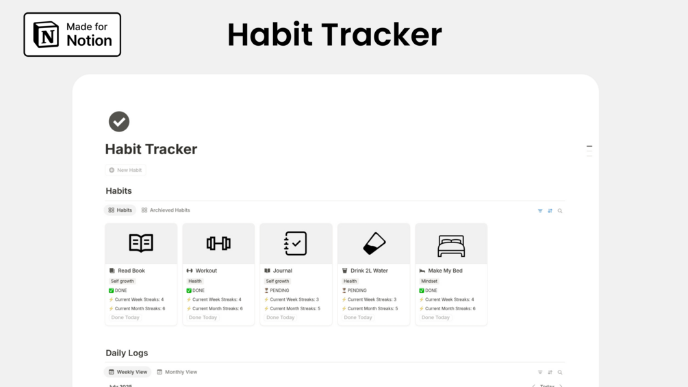 Build better routines with this Notion Habit Tracker Template! Designed with a clean layout and simple interface, it's perfect for daily tracking. Easily log your habits with one click, track unlimited habits, and stay motivated with current week and month streaks—all in one place.