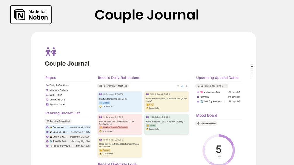 Write daily reflections, track special dates, build your bucket list, and relive your sweetest moments β all in one beautiful Notion template. π·