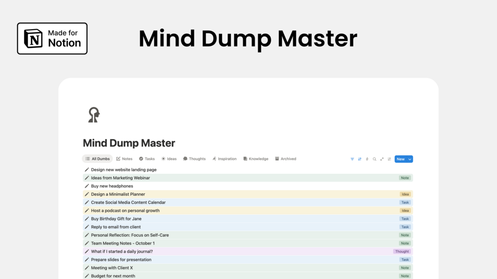 Meet the Mind Dump Master – a clean, minimal template designed to quickly catch your spark of ideas or bits of inspiration. Easily sort everything into notes, tasks, ideas, inspirations, or knowledge. And if something doesn’t fit your current focus? Just archive it. Simple, effective, and a stress-free way to keep your mind clutter-free.