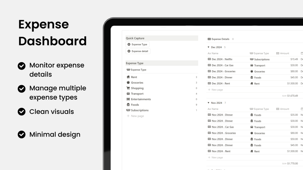 Managing your expenses is an important part of handling your finances. But staying consistent with tracking and calculating everything each month can be tough. With this template, all you need to do is list your expense types and log your spending — that’s it. You’ll get a clear and useful monthly summary of your expenses.
